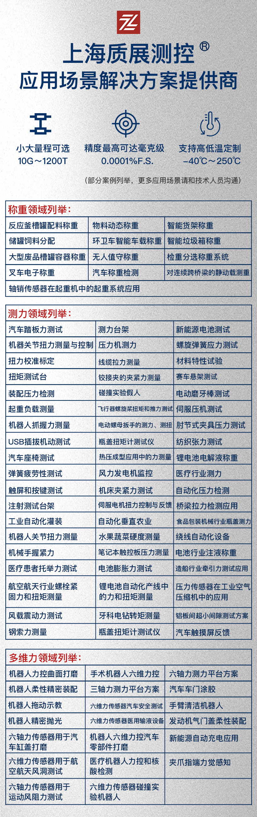 上海质展测控系统有限公司是一家集专业研发、生产、销售及售前、售后服务于一体的高新科技企业。凭借在测控系统、检测方案、力学传感器领域的专业技术,依靠科技求发展,不断为科技提供满意的产品,是我们始终不变的追求。在充分吸收国内外先进技术的基础上,结合客户的实际需求,以一流的产品质量和精湛的技术服务受到了用户的一致好评。取得了与国内外各个行业领域的大、中、小型企业及各类研究设计院、各所高校的长期合作。